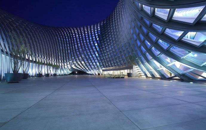 幕墻、結(jié)構(gòu)外殼一體化的設(shè)計概念,將張拉膜結(jié)構(gòu)建筑表皮形式、結(jié)構(gòu)和材料構(gòu)造進行高度的設(shè)計整合。它們的界限在創(chuàng)作中實現(xiàn)融合,表皮既是結(jié)構(gòu),結(jié)構(gòu)也是裝飾,鋼構(gòu)件、鋁板、幕墻玻璃被技巧性地塑造成一個流暢的張拉膜結(jié)構(gòu)建筑曲面。