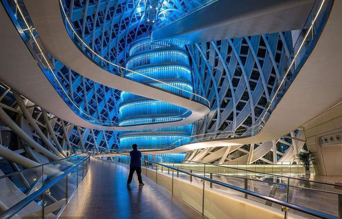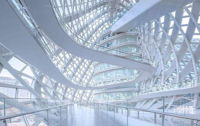 整個莫比烏斯環(huán)的幕墻由4943塊完全不同的玻璃組成,懸掛在“沒有一條是直的”的鋼梁之下。為了表現(xiàn)莫比烏斯環(huán)連續(xù)扭動的形體特征,設(shè)計團隊打造出了一套融合結(jié)構(gòu)力學(xué)和美學(xué)表現(xiàn)力的全新結(jié)構(gòu)體系——雙向疊合網(wǎng)格結(jié)構(gòu)。