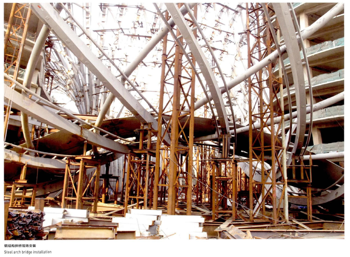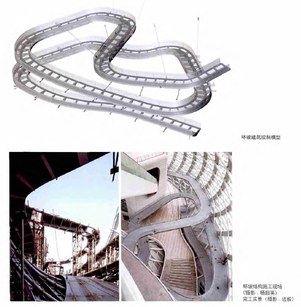在爬升過程中,“夢之橋”先后與外殼鋼結(jié)構(gòu)、主樓及裙房混凝土結(jié)構(gòu)產(chǎn)生搭接關(guān)系,同時還要保證環(huán)坡的外型優(yōu)美流暢。
