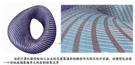 裙房內(nèi)幕墻初始的控制面由復(fù)雜的雙曲面構(gòu)成。為了能在造價允許范圍內(nèi)高質(zhì)量完成設(shè)計控制工作,依靠BIM模型的高精準(zhǔn)性,設(shè)計師們對原始的雙曲面進行了板片優(yōu)化的數(shù)據(jù)分析,確定了板片優(yōu)化的模數(shù)設(shè)置、板片平面外偏差的消納規(guī)則,最終建立起完整的干掛SRC板材幕墻體系模型,用以直接指導(dǎo)后續(xù)的生產(chǎn)加工和安裝工作。