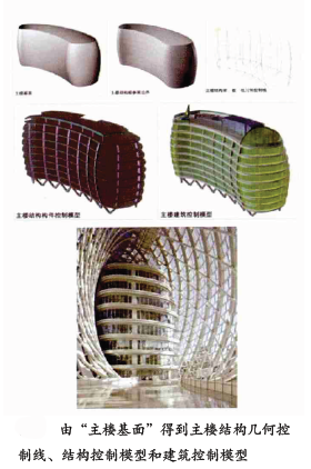 在鳳凰中心南側(cè)辦公主樓的建設(shè)設(shè)計中,設(shè)計師面臨這樣的問題——如何將一個順滑的“主樓基面”發(fā)展為包含多層次張拉膜結(jié)構(gòu)建筑構(gòu)件信息的實體。經(jīng)過嚴(yán)密的、多層級參數(shù)的調(diào)控過程,設(shè)計方由張拉膜結(jié)構(gòu)建筑“基礎(chǔ)控制面”推導(dǎo)出“主樓基面”,再由“主樓基面”定義完整的主樓梁、板、柱結(jié)構(gòu)幾何控制線,最后以結(jié)構(gòu)幾何控制線為基礎(chǔ)加入張拉膜結(jié)構(gòu)建筑裝修幾何控制系統(tǒng)。