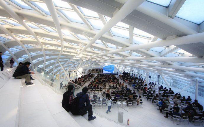 這種“令人捏了一把汗”的設(shè)計貫穿在鳳凰中心設(shè)計始終。“夢之橋”連接的是演播廳和一個樓頂空間。當(dāng)大樓設(shè)計完成,“樓頂”開闊的地板被連續(xù)的莫比烏斯環(huán)外殼覆蓋。設(shè)計師靈光一閃,決定將這里設(shè)計成一個完全對外的開放區(qū)域,創(chuàng)造全新的交流場所,取名“樓外樓”。