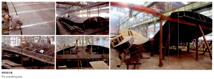 彎扭板材只是完成了第一步,更大的挑戰(zhàn)在于如何將這些板材拼接在一起,“精度”和“進度”成為了加工方的雙重挑戰(zhàn)。以造船技術(shù)為基礎(chǔ),加工方制作了“樣箱”。