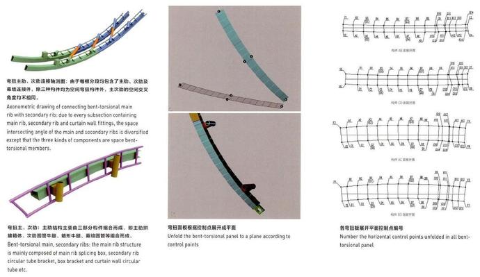 一是張拉膜結(jié)構(gòu)建筑外墻的鋼結(jié)構(gòu)主肋,其截面呈梯形,截面尺寸又非常小,高750mm,寬330-500mm,由四塊鋼板拼接組成空間三維彎扭結(jié)構(gòu);二是環(huán)形坡道“夢之橋”,它的平面是弧形,縱向高低又是弧形,橫截面是月牙形,幾乎沒有一個面是直的。