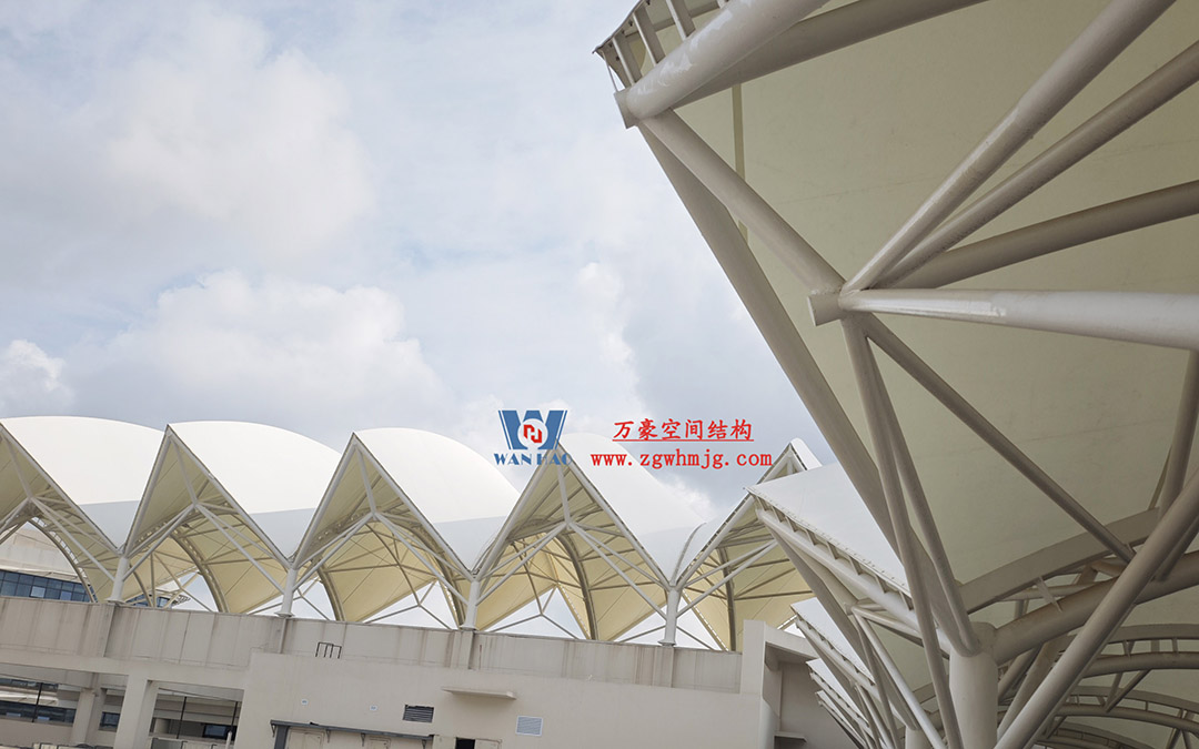 海南醫(yī)學(xué)院第一附屬醫(yī)院江東新院區(qū)膜結(jié)構(gòu)工程,該項(xiàng)目用鋼量約360噸,PTFE膜結(jié)構(gòu)展開(kāi)面積約4500平米。