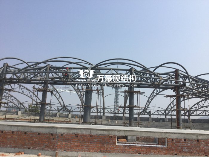 橫店夢幻谷海豚館鋼膜結構,前兩張為鋼結構圖片,后面的是安裝上藍色膜結構后的圖片