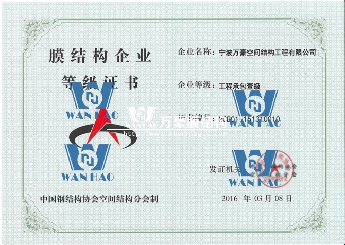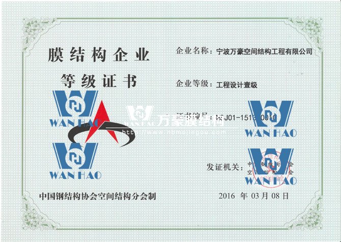 憑借著公司的硬實力,寧波萬豪空間結構工程有限公司在膜結構企業(yè)等級會員第十六次評審中榮獲工程承包、專項設計雙一級資質。標志著公司向前更進一步,也是協(xié)會對公司實力的認可,公司將不斷努力,為膜結構行業(yè)的發(fā)展貢獻自己的力量。