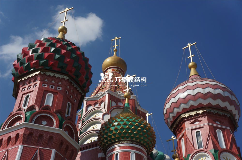 項目坐落于浙江省東陽市橫店影視城圓明新園皇家園林內(nèi),金色穹頂標(biāo)高達(dá)61.2米,單個穹頂重量達(dá)17噸。穹頂結(jié)構(gòu)充分利用鋼結(jié)構(gòu)異形特性,完美重塑俄羅斯圣瓦西里大教堂的莊嚴(yán)宏偉,完美再現(xiàn)圓明園萬國建筑的雍容華貴。