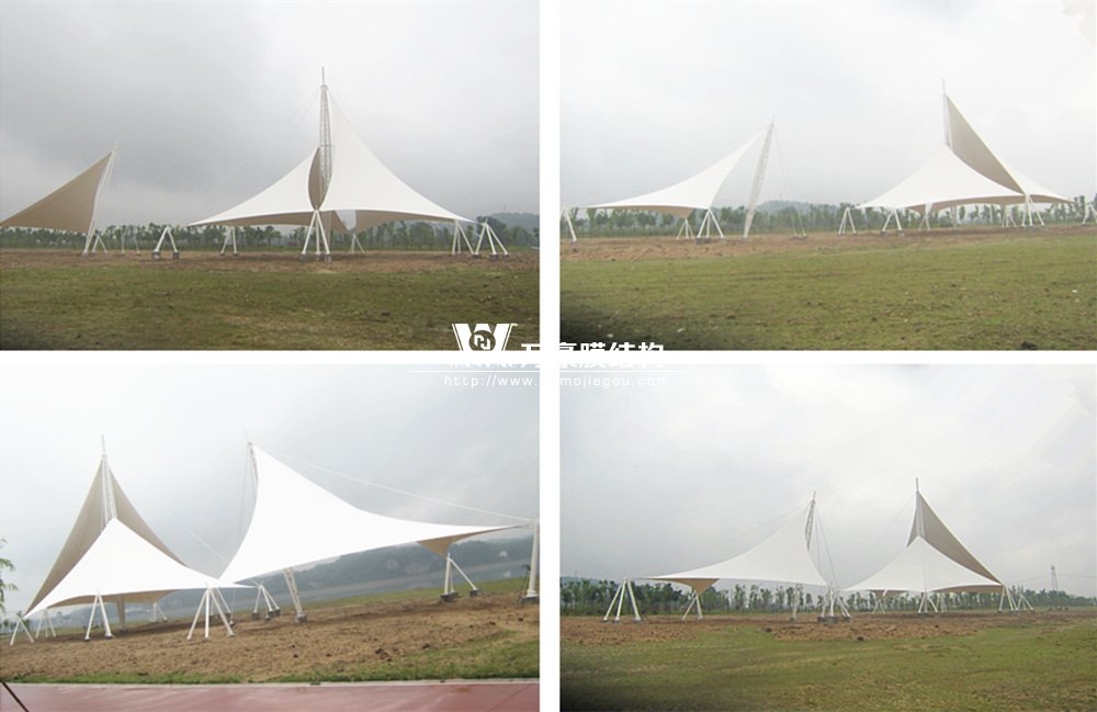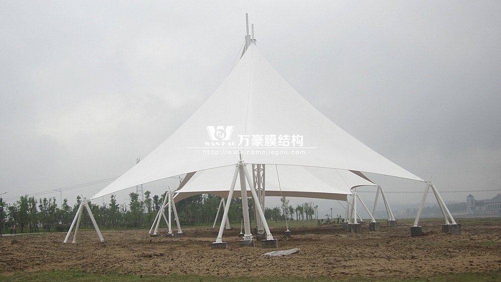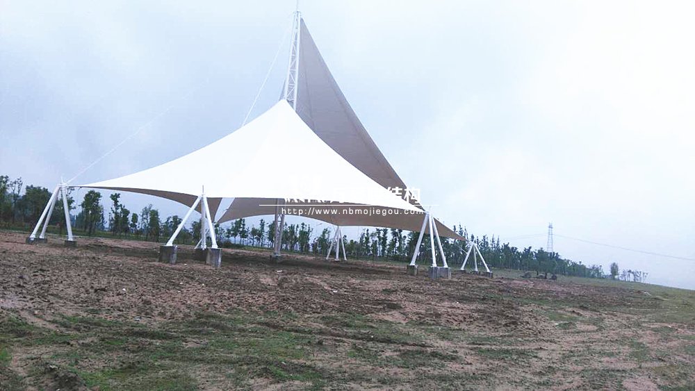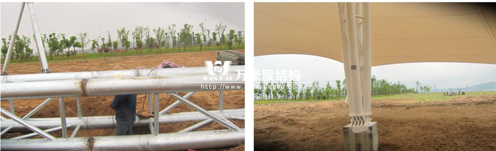 本景觀膜結(jié)構(gòu)安全等級(jí)為二級(jí),膜材選用意大利進(jìn)口雙面PVDF超自潔涂層膜材,鋼結(jié)構(gòu)設(shè)計(jì)使用年限25年。張拉膜近2千㎡、高度26.88米,總用鋼量約為57.69噸。桁架、鋼管材質(zhì)均為Q345B鋼,相貫焊接。所有鋼構(gòu)件熱鍍鋅處理,運(yùn)輸、安裝過程中對(duì)涂層的損傷,須視損傷程度的不同釆取相應(yīng)的修補(bǔ)方式,對(duì)拼裝焊接的部位必須清除焊渣,進(jìn)行表面處理達(dá)到St3級(jí)要求后,涂刷環(huán)氧無機(jī)富鋅底漆+環(huán)氧云鐵中間漆+氟碳面漆。