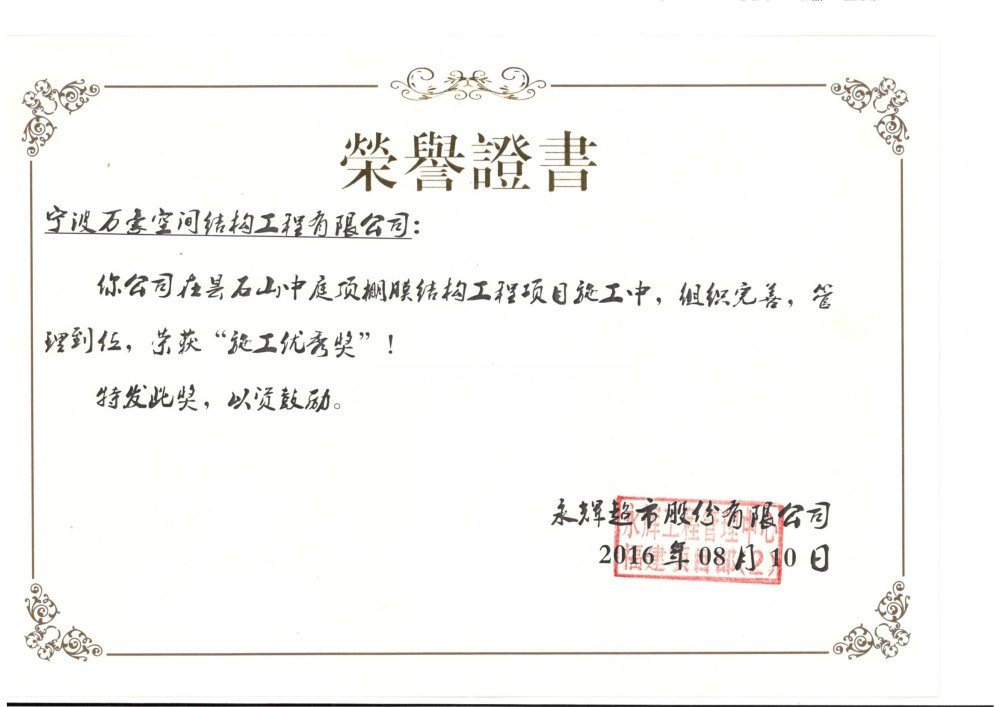 我司承建的福建永輝超市頂棚膜結(jié)構(gòu)工程項(xiàng)目獲得業(yè)主頒發(fā)“施工優(yōu)秀獎(jiǎng)”。