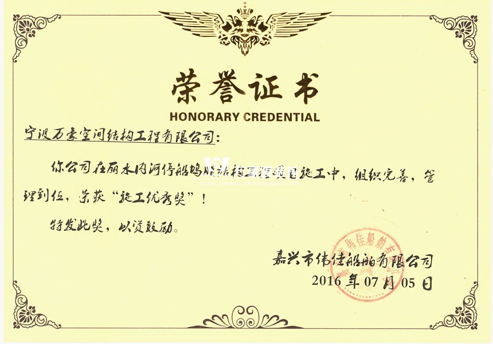 我司承建的浙江麗水內(nèi)河停船塢膜結(jié)構(gòu)工程項(xiàng)目獲得業(yè)主頒發(fā)“施工優(yōu)秀獎(jiǎng)”。