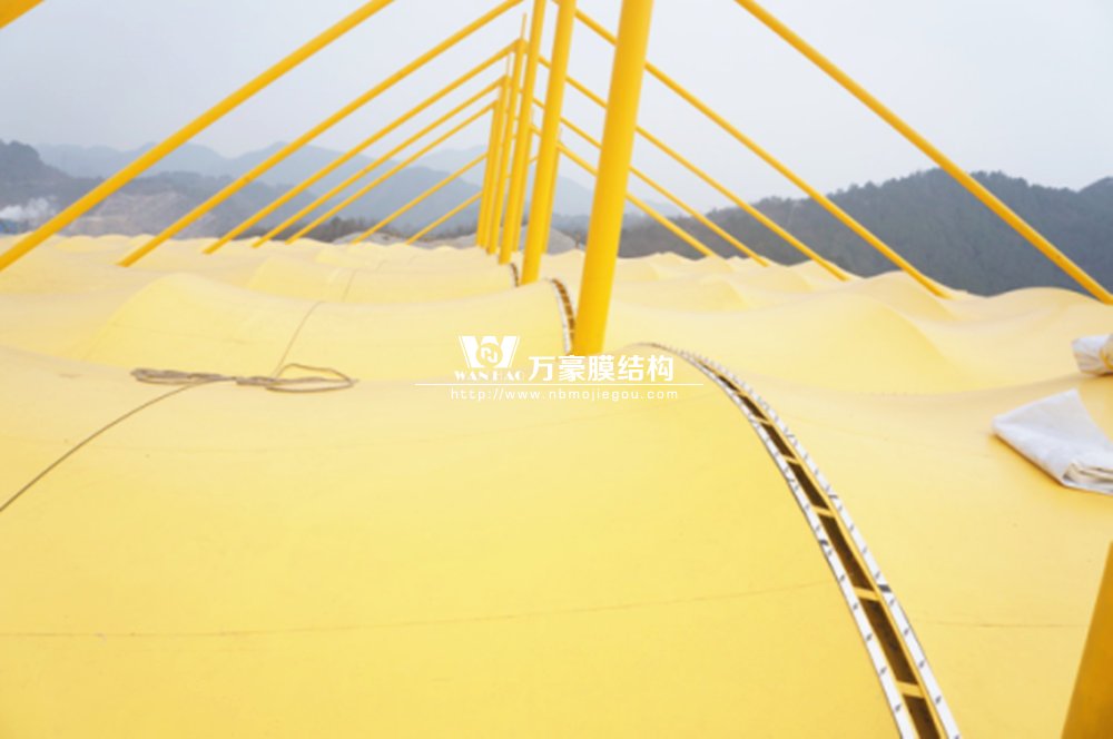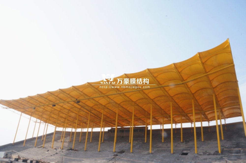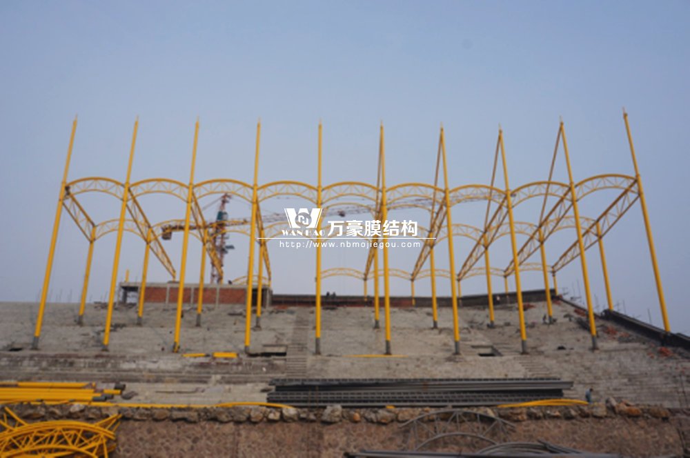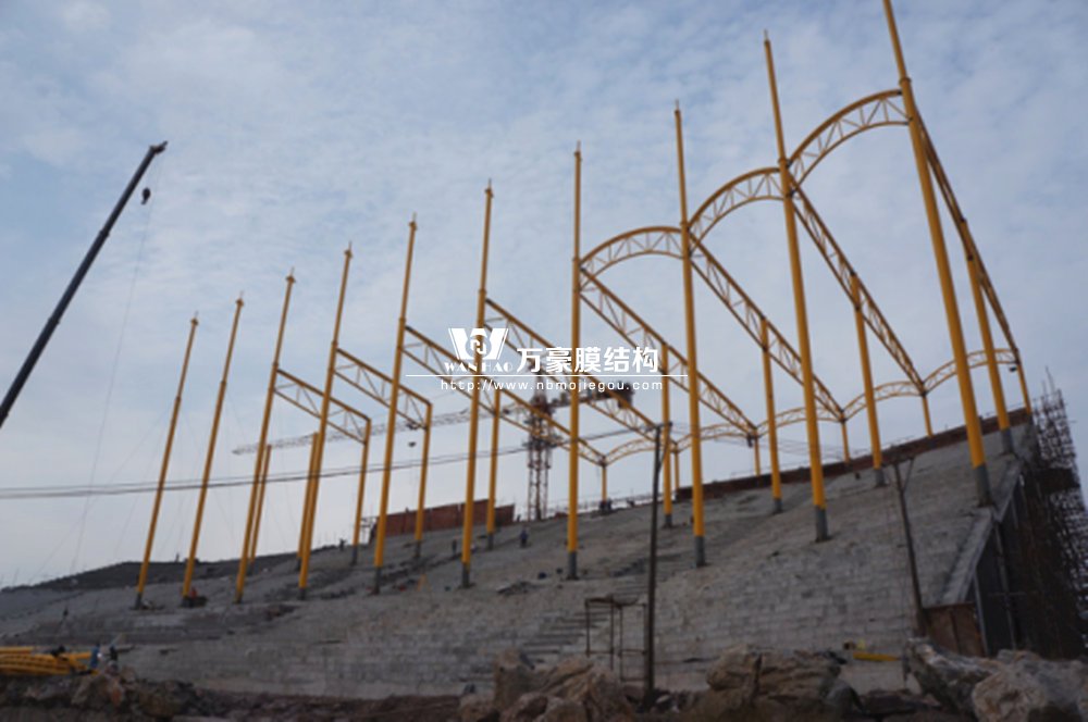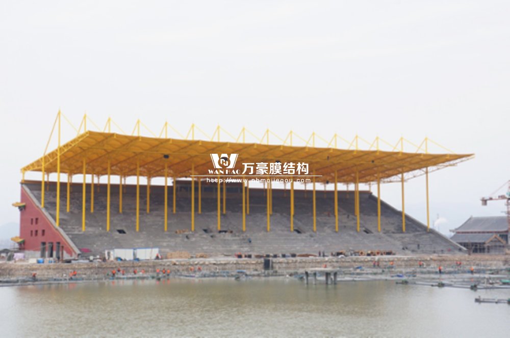 橫店影視城被一圈連綿起伏的山巒包圍著,層疊的遠山宛如水墨畫。圓明新園則位于小鎮(zhèn)西邊的山巒中,芳草萋萋、溪水潺潺!花仙湖膜結構看臺坐落于圓明新園春苑東北角,為骨架支撐式膜結構,建筑面積約為16000㎡,看臺主體結構可分為15個單元,屋面膜結構則由30片膜組成。主體結構劃分為四大部分:鋼柱、主桁架、次桁架和馬道。鋼柱高34.76米,單個重量達8.2噸;主桁架長70.66米,柱間距15米,看臺屋面猶如浮動的金色流云,徜徉在花仙湖上空。此項目為全國最大的“水戲”表演建筑的看臺,同時也是水上樂園彩色膜結構最大的一個景觀。