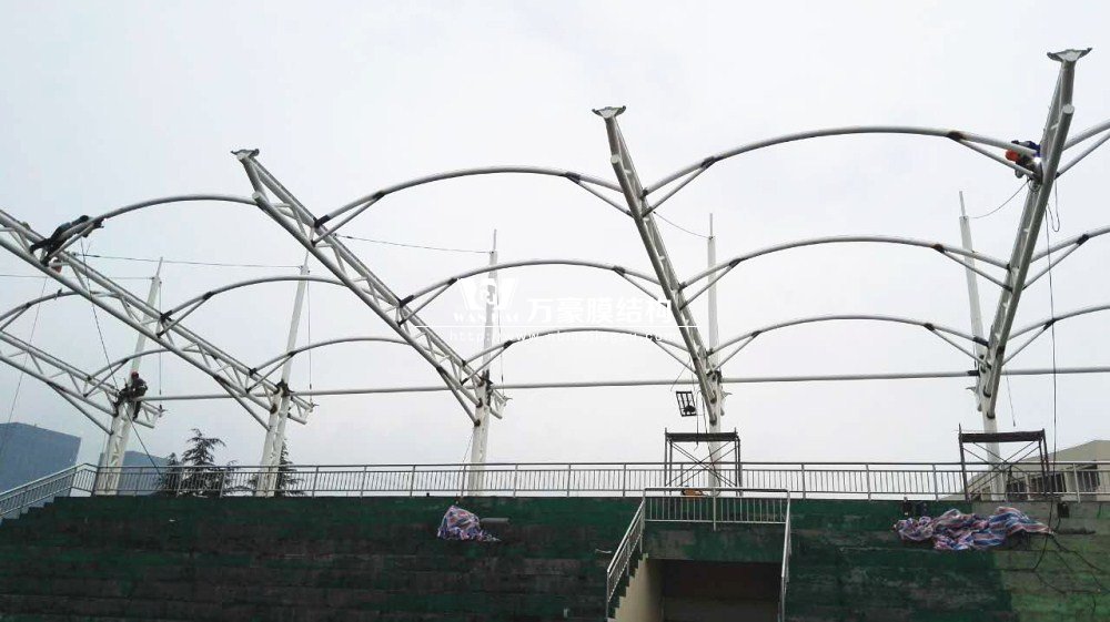 膜結(jié)構(gòu)看臺(tái)在學(xué)校作為一個(gè)景觀點(diǎn)。所以選用了膜結(jié)構(gòu),使得在造型上可以輕盈多變??磁_(tái),主要給觀看比賽的人一個(gè)休息的場所,需要有通透的視線,而膜結(jié)構(gòu)剛好具有這一方面的有點(diǎn)。所以我們在享受了他遮陽效果的同時(shí),也并不會(huì)感覺特別的黑暗。對于整體的看臺(tái),可以達(dá)到非常完美的效果。