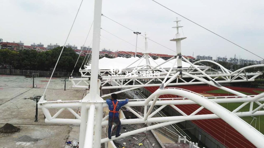 項(xiàng)目坐落在上海市青浦區(qū)公園東路1100號(hào),上海市青浦高級(jí)中學(xué)運(yùn)動(dòng)場內(nèi)。由15根雙立柱支撐,15榀桁架懸挑均勻受力及14塊跨度較大的意大利進(jìn)口耐馳二氧化鈦NZ-1400-3膜材張拉而成。鋼構(gòu)總重約100噸,膜面積約2100平。