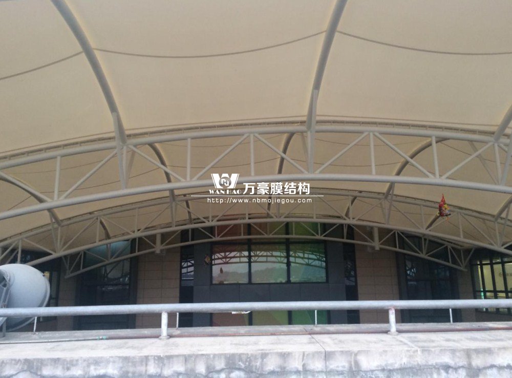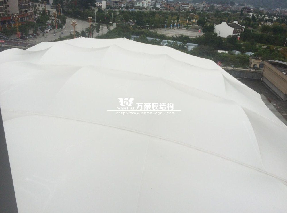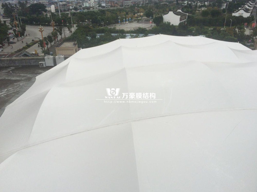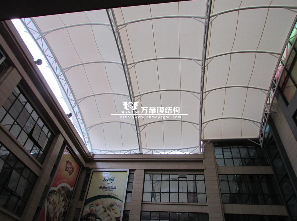 本工程系永輝超市曇石山店中庭頂棚膜結構工程,位于福建省福州市閩侯縣城新區(qū)曇石山西大道3號新永輝超市曇石山店樓頂,該工程為鋼桁架膜結構立體造型,以桁架為主要結構的骨架式單層膜結構,上面采用進口意大利耐馳膜材覆蓋??偯娣e約800平方米,鋼構約25噸。該工程施工難度較大,該樓中庭商鋪已經投入使用,大型吊車無法進入施工,只能用小型吊車加人工共同來進行施工,還有底下商鋪和地面成品保護和安全也是此次施工一大難點。用了大批的模板保護地面,同時施工時安排了安全督導人員,對客人進行引導。工程完工后,受到了業(yè)主和客人的好評!