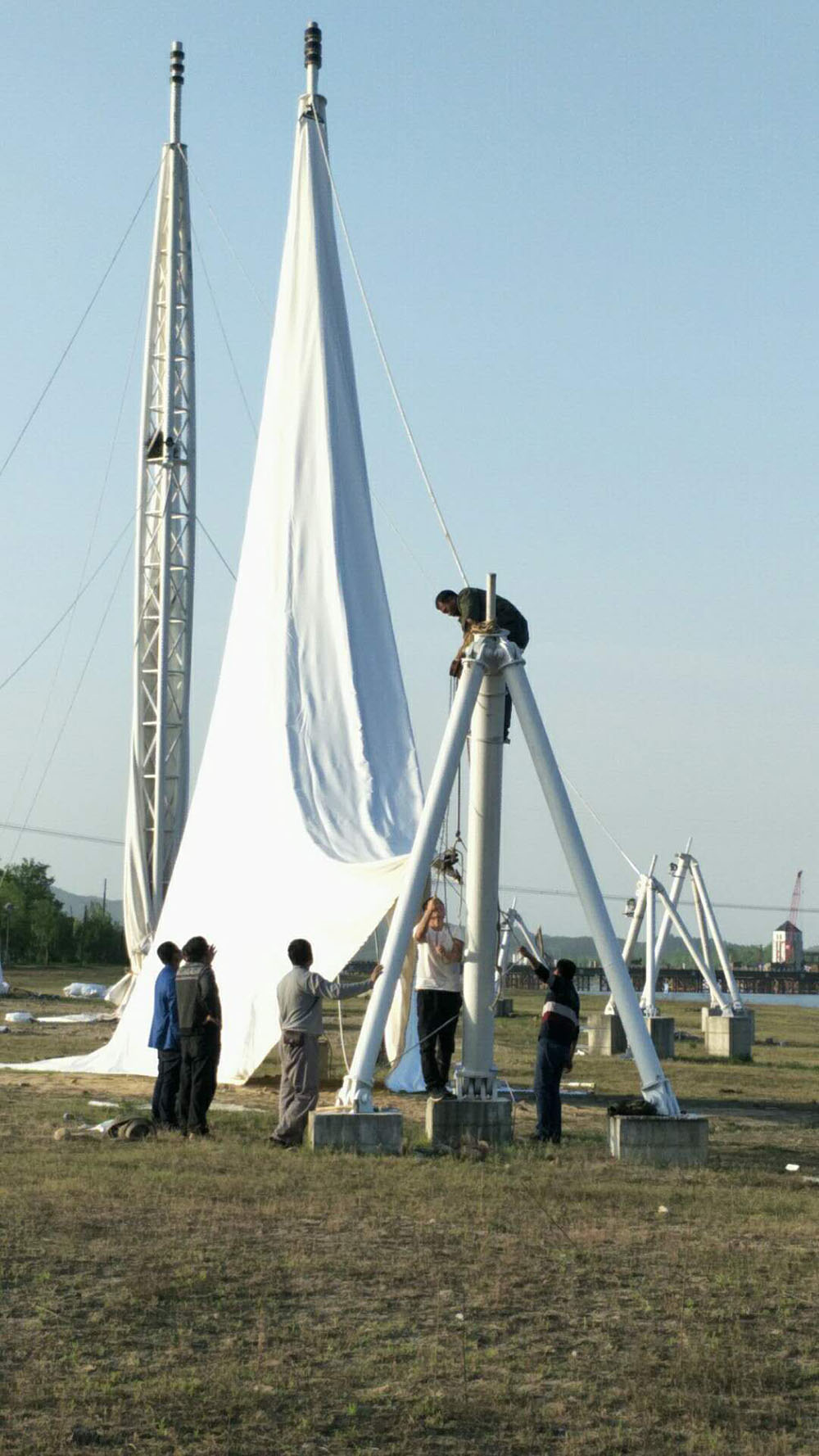 應(yīng)對與高起點規(guī)劃、高標(biāo)準(zhǔn)建設(shè)的原則,寧波萬豪空間結(jié)構(gòu)工程有限公司完美的完成了此次工程。本景觀膜結(jié)構(gòu)安全等級為二級,膜材選用意大利進(jìn)口雙面PVDF超自潔涂層膜材,鋼結(jié)構(gòu)設(shè)計使用年限20年??偨ㄖ娣e約為860平方米,總用鋼量約為27.69噸。桁架、鋼管材質(zhì)均為Q235B鋼,相貫焊接。所有鋼構(gòu)件熱鍍鋅處理,運輸、安裝過程中對涂層的損傷,須視損傷程度的不同釆取相應(yīng)的修補(bǔ)方式,對拼裝焊接的部位必須清除焊渣,進(jìn)行表面處理達(dá)到St3級要求后,涂刷環(huán)氧無機(jī)富鋅底漆+環(huán)氧云鐵中間漆+氟碳面漆。