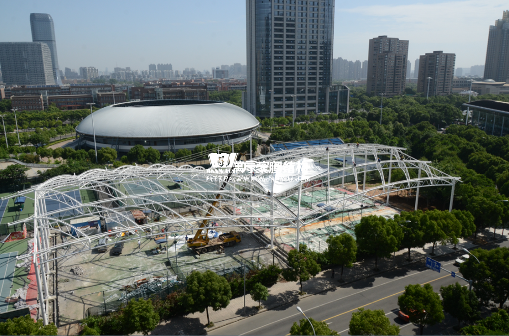 鄞州網球中心膜結構遮陽棚工程鋼結構已完成并