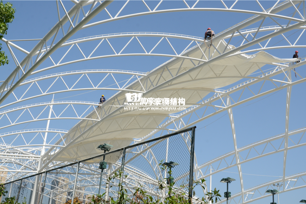 項目為單片網球場罩篷。采用骨架式結構體系,集休閑、運動、標志性建筑于一體。鋼結構采用Q235B高頻焊管,膜材采用進口建筑膜材,顏色為白色。結構包括膜材、鋼管、鋼索、壓條四種材料。膜材緊貼弧拱,四邊通長固定在專用拉膜板上。膜面呈弧拱形平滑過渡,結構流暢簡潔、美觀大方,極富動感,整體建筑造型集實用功能與景觀于一體,透光與隔熱性能良好,富含現代氣息,氣勢恢弘,彰顯企業(yè)形象。