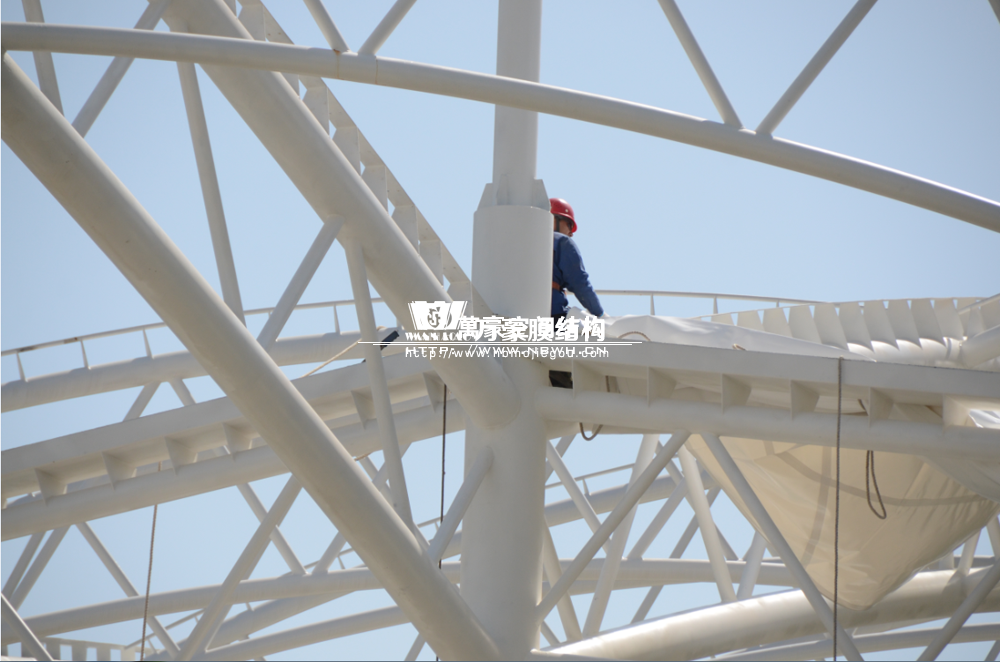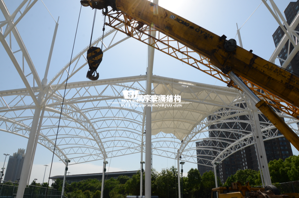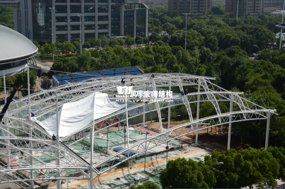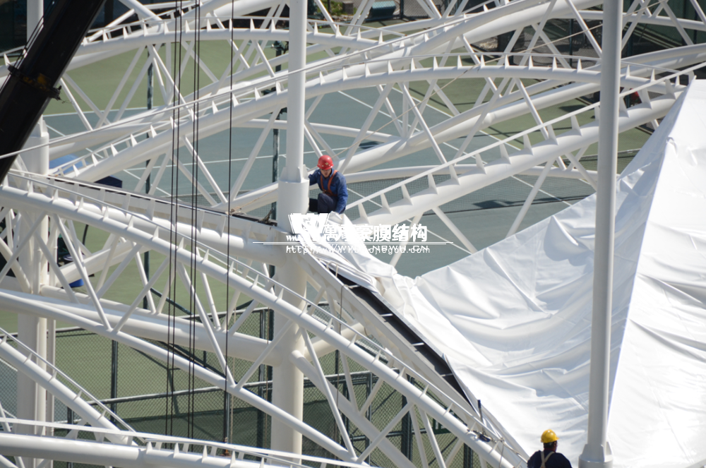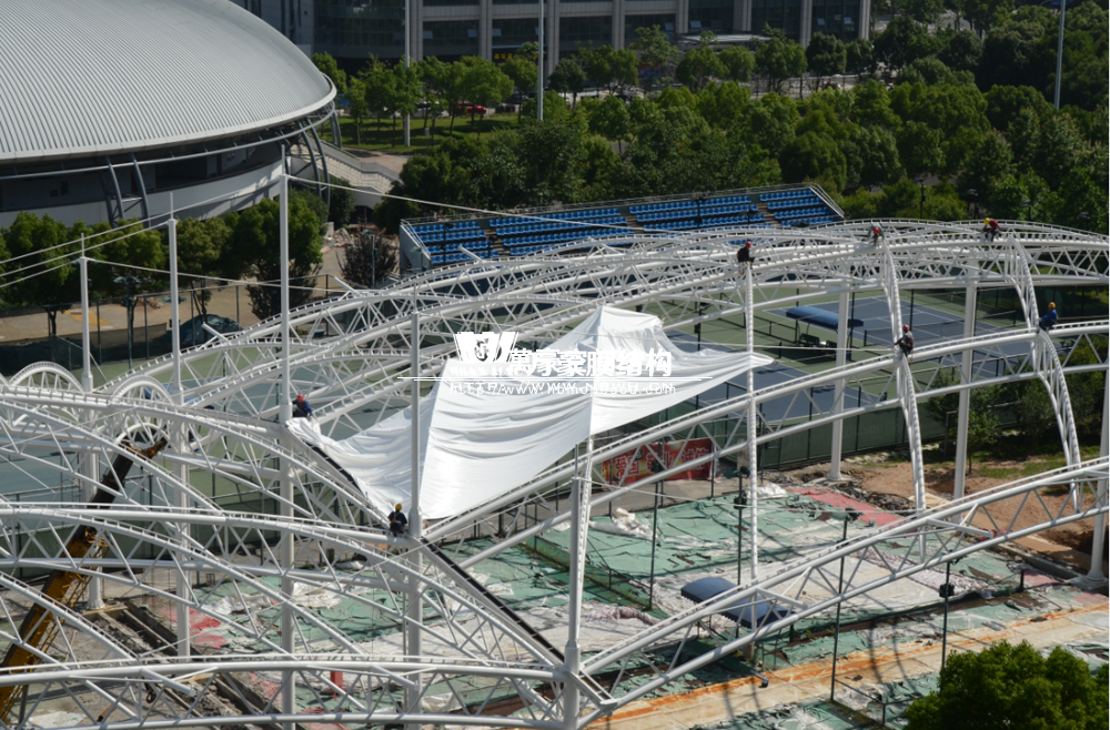 大家還記得寧波(鄞州)網球中心膜結構遮陽棚工程嗎?經過緊張的施工,鋼結構已完成并經初步驗收,膜結構開始安裝,得到了客戶高度的贊賞。