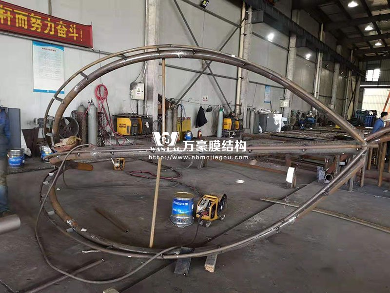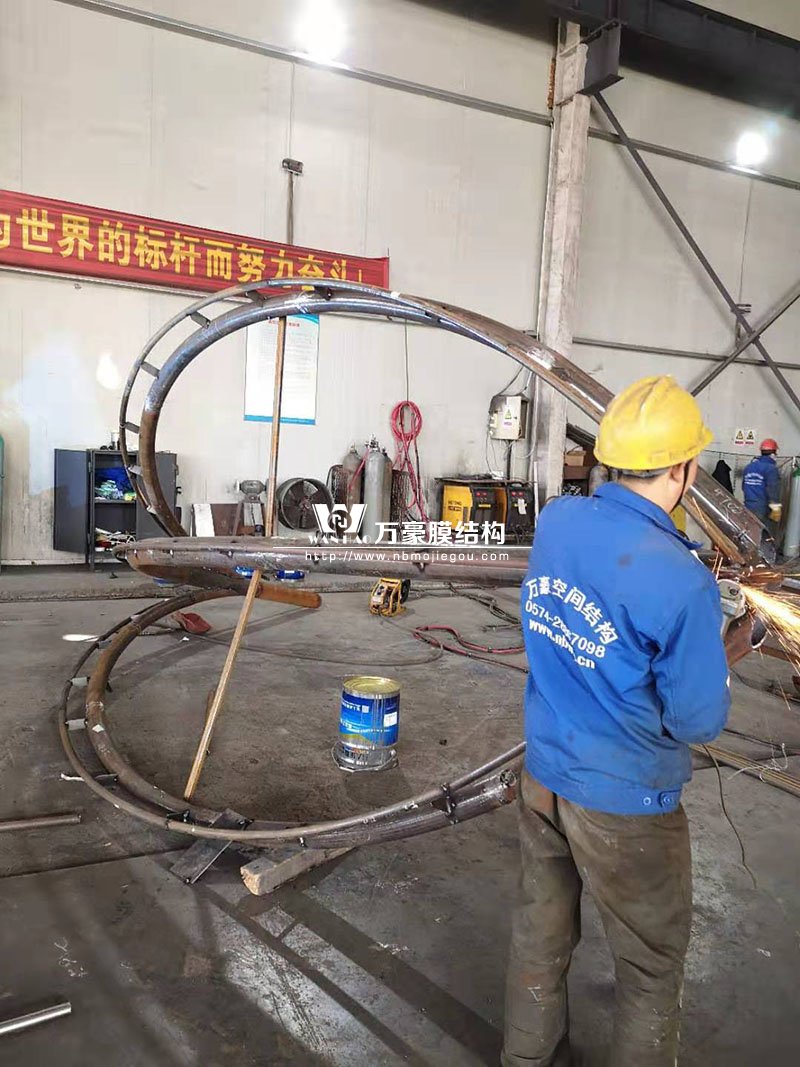 最近,萬(wàn)豪空間結(jié)構(gòu)又新接了一個(gè)加工項(xiàng)目,那就是湖州花樣年華鋼結(jié)構(gòu)、膜結(jié)構(gòu)加工項(xiàng)目。這個(gè)項(xiàng)目是一個(gè)景觀項(xiàng)目,鋼結(jié)構(gòu)由九朵花組成,每朵花有六個(gè)花瓣,每個(gè)花瓣上所有的圓管全部是雙曲面。該項(xiàng)目加工難度比較大,每一個(gè)圓管都要三維坐標(biāo)放樣,由不同的半徑拼接起來(lái),所以每個(gè)花瓣必須全部在胎具上制作?;幽耆A項(xiàng)目是網(wǎng)格膜結(jié)構(gòu),防腐處理采用鍍鋅加油漆,效果十分不錯(cuò),大家可以欣賞一下加工過(guò)程。