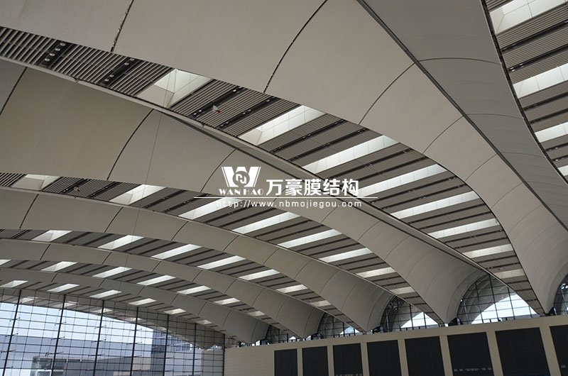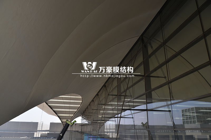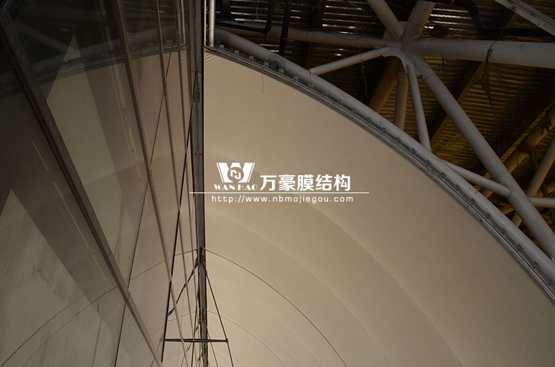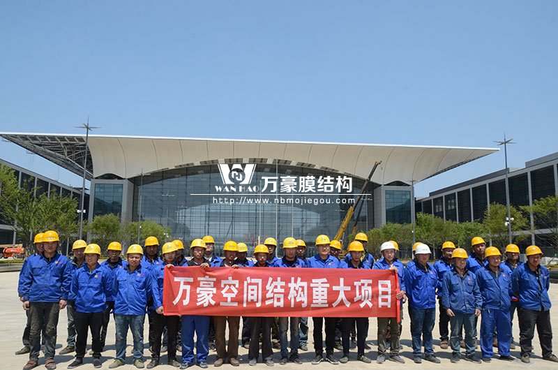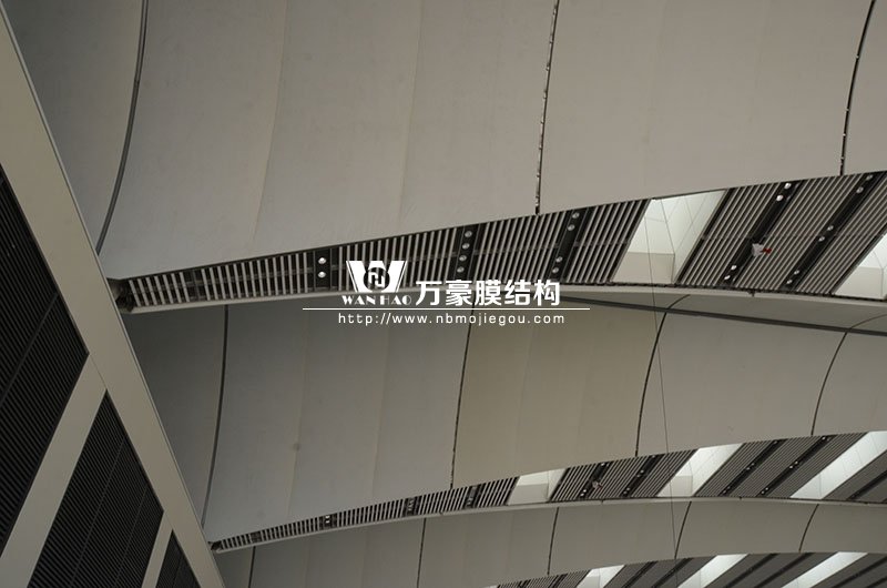 萬豪膜結(jié)構(gòu)承建了此項目的幕墻工程,現(xiàn)場測量、深化設(shè)計、制作及安裝由寧波萬豪全權(quán)負(fù)責(zé);該工程用鋼量1000多噸,PTFE室內(nèi)屋面膜結(jié)構(gòu)展開面積17000多平方米,PTFE室外屋面膜結(jié)構(gòu)展開面積20000多平方米。