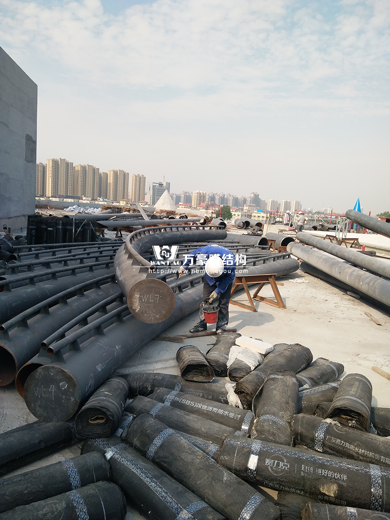 目前一號云朵鋼柱立起3根,懸挑管架全部拼裝完畢,桁架拼裝完成;二號云朵鋼柱立起3根,桁架、漏斗已基本到位,懸挑構(gòu)件焊接中;三號云朵鋼柱焊接中,隔板、環(huán)板正在有序拼裝。