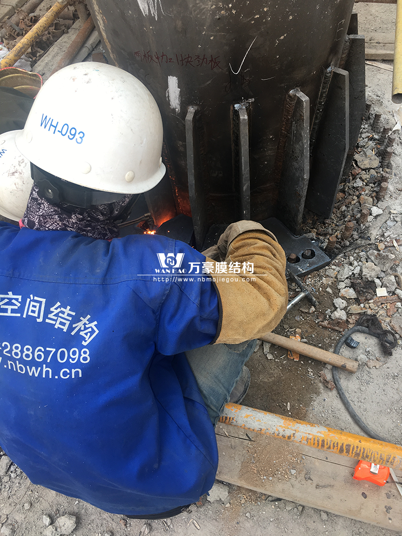 該項目設(shè)計思路沿用了上海世博軸的倒傘形狀,其中最大的一個傘形面積達8000平米,工程共計用鋼1500噸,膜結(jié)構(gòu)展開面積3萬平米,是鋼、膜、索結(jié)合真正意義上的大型索膜結(jié)構(gòu)。