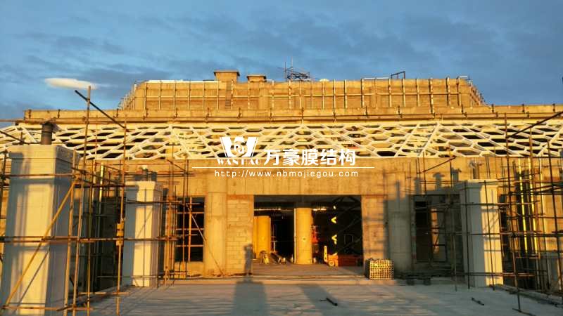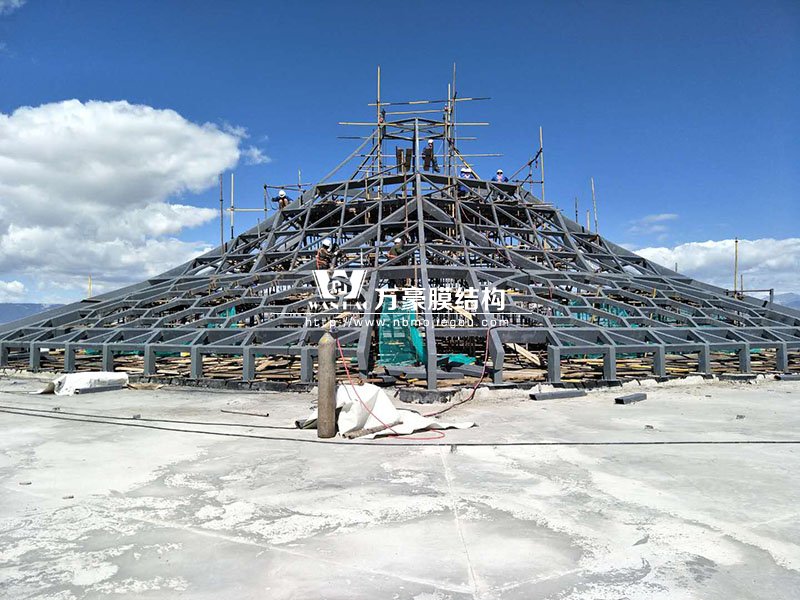 目前,觀光塔鋼膜結構項目架子已搭建完畢,接下來要做的是防護工作。綜合辦公樓鋼膜結構項目穹頂鋼構預計月底之前完成;斜屋面已做好三個面,其中兩個面已做完油漆,預計七月中旬斜屋面鋼構全部完成。