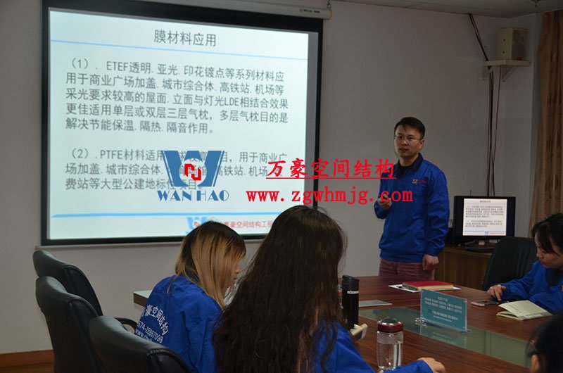 然后,我們的銷售主管教員工們學(xué)習(xí)了膜材料分類、膜結(jié)構(gòu)優(yōu)勢(shì)及應(yīng)用領(lǐng)域、膜結(jié)構(gòu)產(chǎn)品結(jié)構(gòu)形式等。