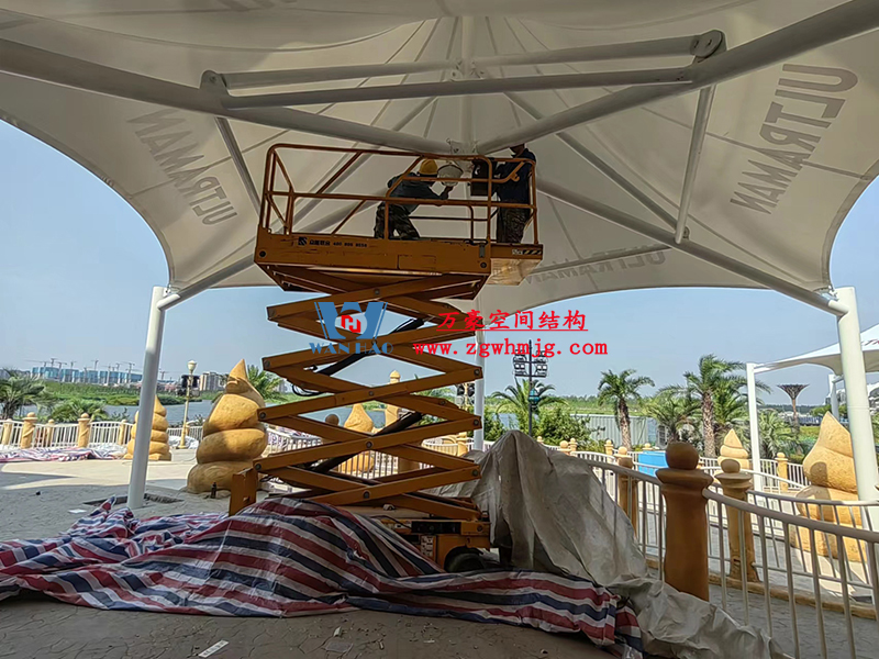 目前,海昌海洋公園沙塔餐廳室外鋼膜結(jié)構(gòu)完工,虎鯨劇場排隊區(qū)鋼膜結(jié)構(gòu)開始施工。